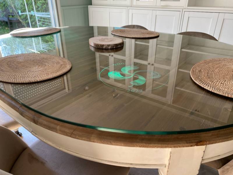 Cette table en verre d’une épaisseur de 12mm a été réalisée ici dans notre atelier, à Gradignan près de Bordeaux. Notre client voulait personnaliser ce grand plateau de verre (2300x1100mm) pour décorer la salle à manger du AirBnB : un grand format de verre, un logo très personnalisé sur le thème du sud-ouest et des Landes à faire graver sur le dessus de la table.